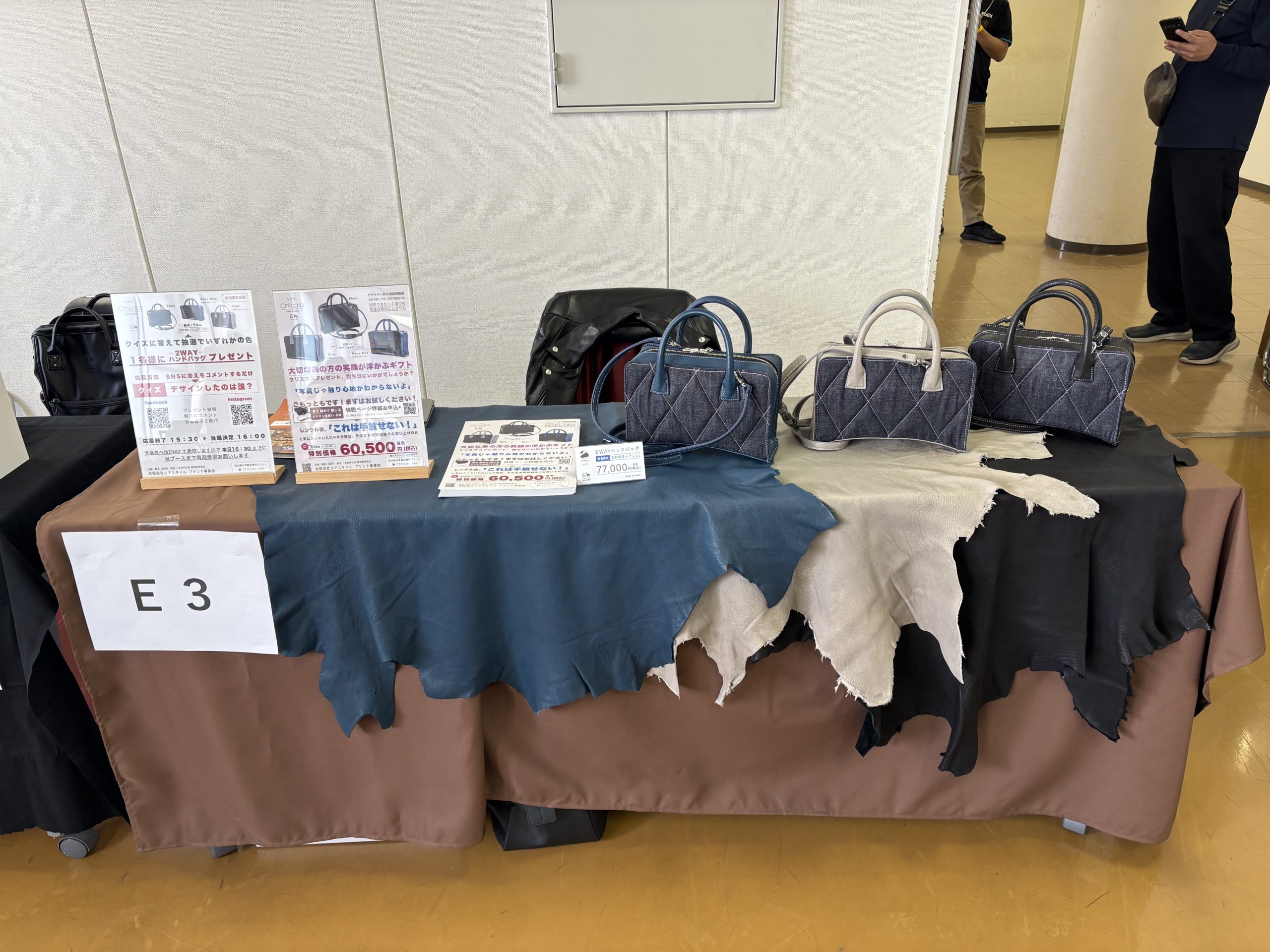 今回は、鹿革バッグの物販で展示物の配置に工夫をこらし、ハンドバッグに実際に使用した本物の革を展示、一部の方から実際に触っていただきました。「やわらかい」という感想をいただきました。